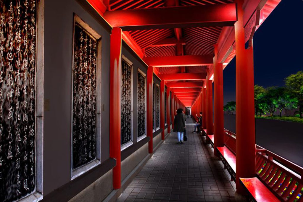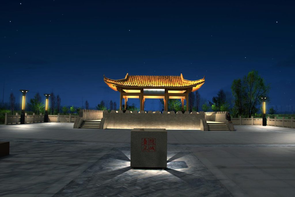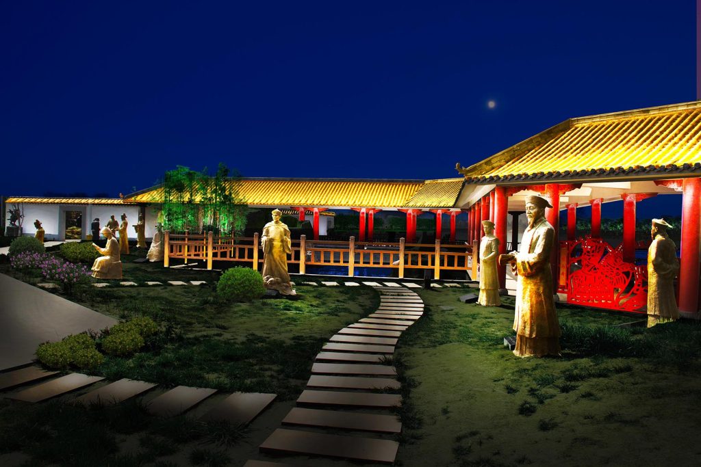 This scene features Cultural tourism lighting planning and design centered on visual storytelling. We use floodlighting design to highlight the mural (aligned with Lighting Art Sculpture Design principles), while architectural lighting design accents the traditional roof elements on both sides. Outdoor lighting design frames the open plaza, creating a cultural display space merging art and lighting design for tourism appeal.