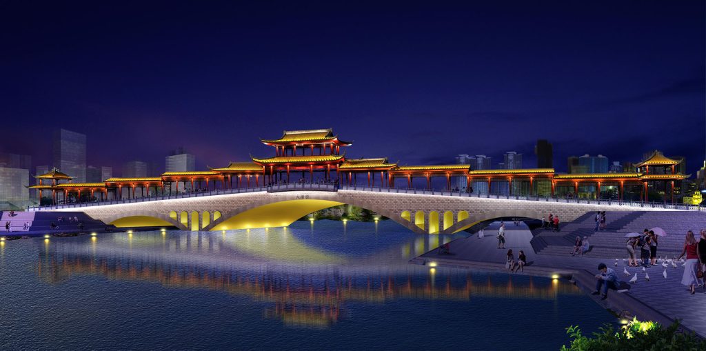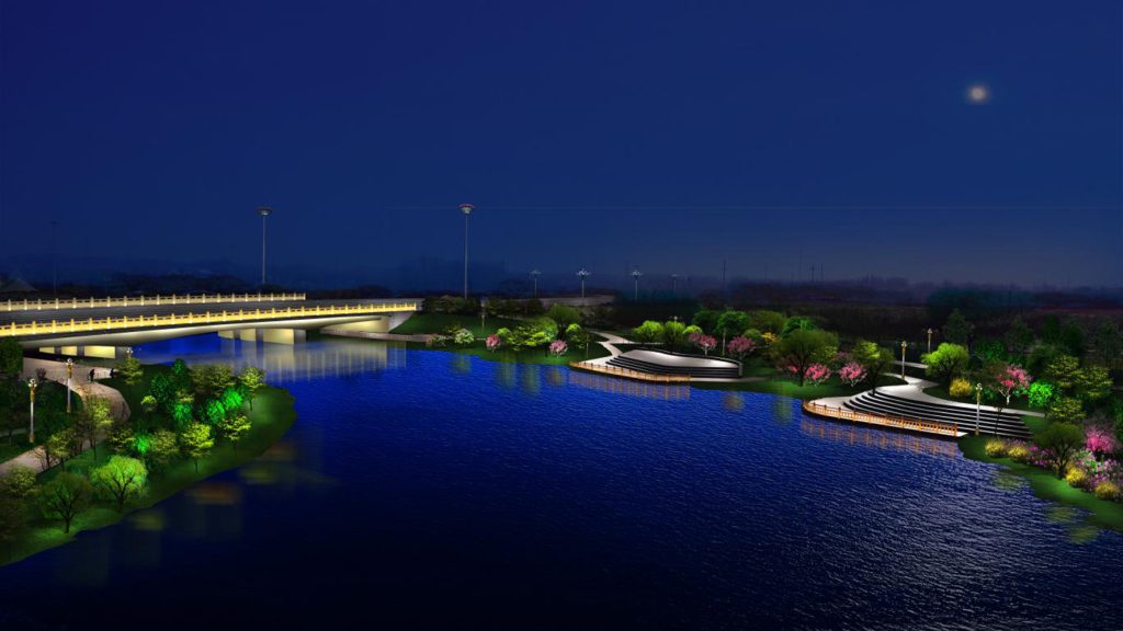 This waterscape showcases Park landscape Lighting Design integrated with Cultural tourism lighting planning and design. Our outdoor lighting design illuminates riverside vegetation and walkways, paired with architectural lighting design for the bridge’s nighttime outline. Floodlighting design adds depth to scenic nodes, crafting a cohesive, visually appealing riverside space that enhances cultural tourism nighttime leisure experiences.