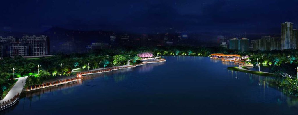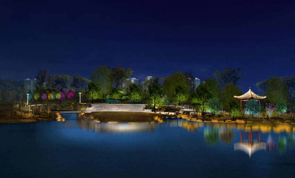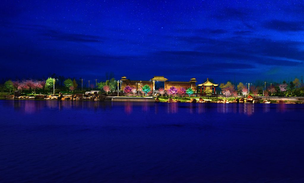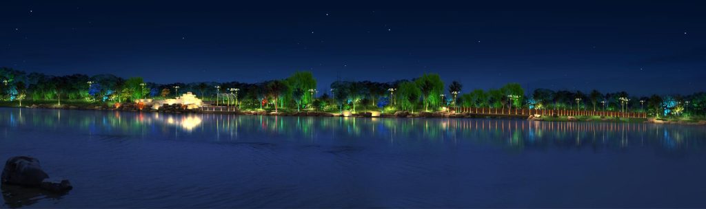This panoramic lakeside scene embodies our Cultural tourism lighting planning and design. We apply Park landscape Lighting Design and outdoor lighting design to illuminate lush vegetation and scenic spots, while floodlighting design accents distant architectural nodes. The layered lighting design blends seamlessly with water reflections, crafting a serene yet vivid nocturnal ambiance that elevates the cultural tourism appeal of the landscape.