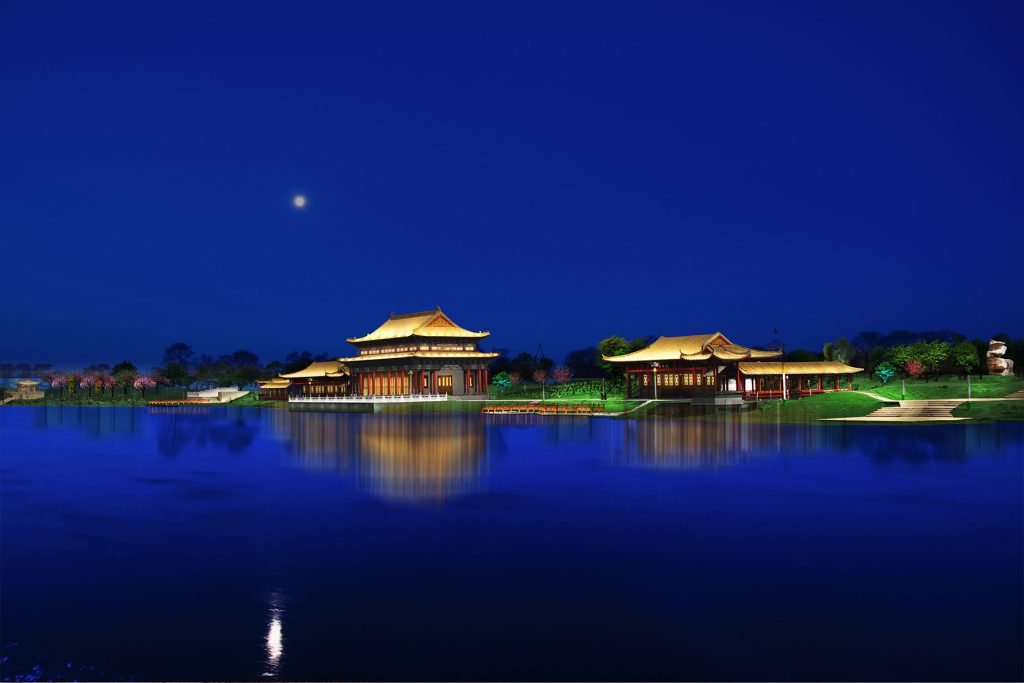 This image exemplifies exquisite Ancient Building Lighting Design. We employ refined architectural lighting design and floodlighting design to outline the traditional structure’s elegant contours, aligning with Cultural tourism lighting planning and design principles. Outdoor lighting design illuminates surrounding vegetation, while water reflections amplify the serene ambiance. The scheme highlights the ancient building’s historical charm, creating an immersive nighttime experience that embodies professional lighting design for cultural tourism destinations.