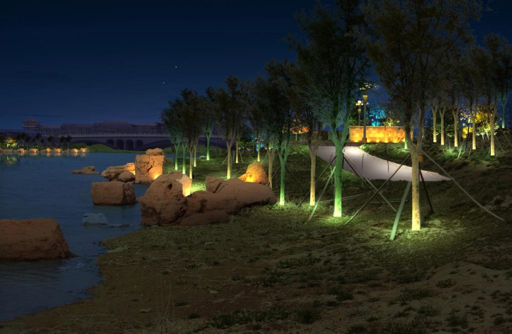 This riverside scene embodies thoughtful Park landscape Lighting Design. Our outdoor lighting design illuminates the trees and walkway, while floodlighting design accentuates scenic rocks along the bank. The lighting design maintains a natural, gentle ambiance, enhancing the area’s nighttime accessibility and leisure appeal. It fits seamlessly into Cultural tourism lighting planning and design, creating a serene, inviting riverside space for visitors to enjoy after dark.