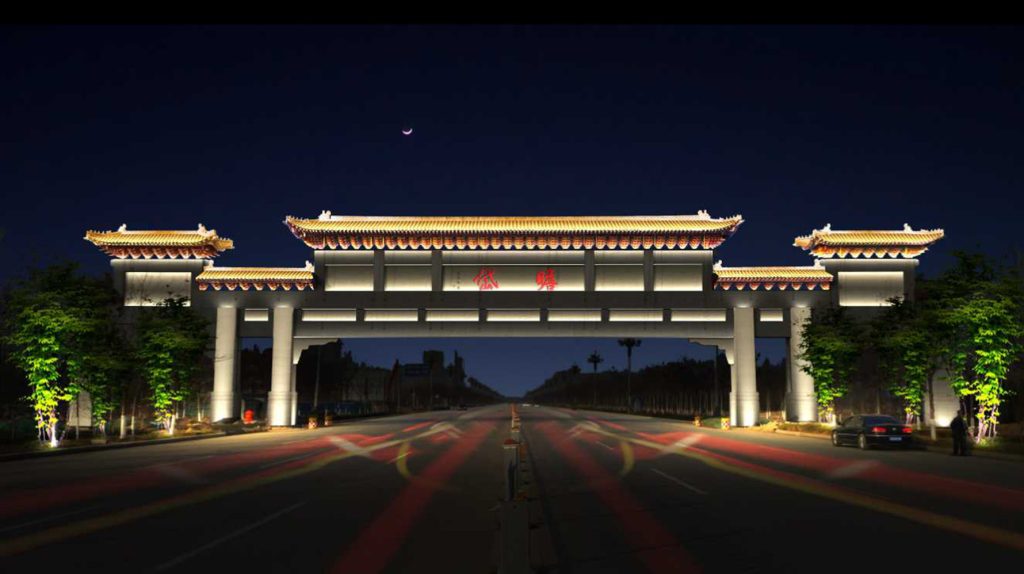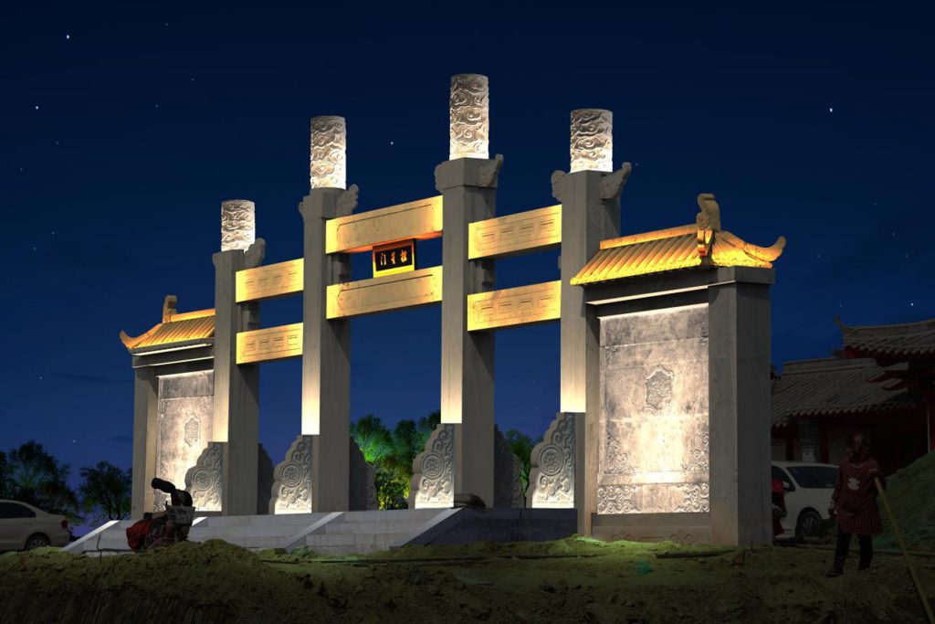 This structure exemplifies Ancient Building Lighting Design and Landmark Building Lighting Design. Under Cultural tourism lighting planning and design, we deployed architectural lighting design and floodlighting design to accent its carved details and golden roof, while outdoor lighting design illuminates the road and flanking greenery. The scheme frames it as a distinctive cultural tourism entrance landmark.