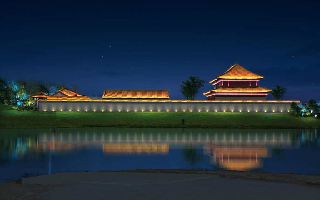 This scene features Ancient Building Lighting Design aligned with Cultural tourism lighting planning and design. Our architectural lighting design and floodlighting design outline the wall’s contours and the pavilion’s golden roof, while outdoor lighting design illuminates adjacent greenery. Water reflections amplify the grand, tranquil ambiance—demonstrating how lighting design elevates historical architecture for cultural tourism.