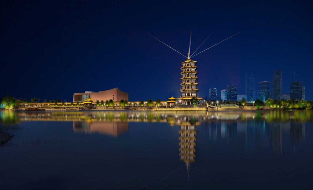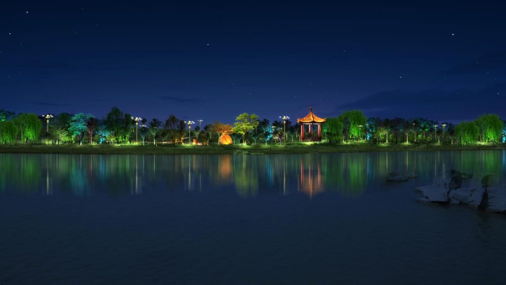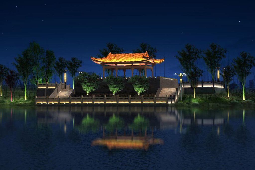 This waterfront scene features our Landmark Building Lighting Design: Dynamic floodlighting design highlights the pagoda’s multi-tiered structure, while outdoor lighting design (pathway fixtures) and Park landscape Lighting Design (waterfront vegetation glows) frame the space. Rooted in Cultural tourism lighting planning and design, it elevates the site as a key nocturnal tourism focal point.