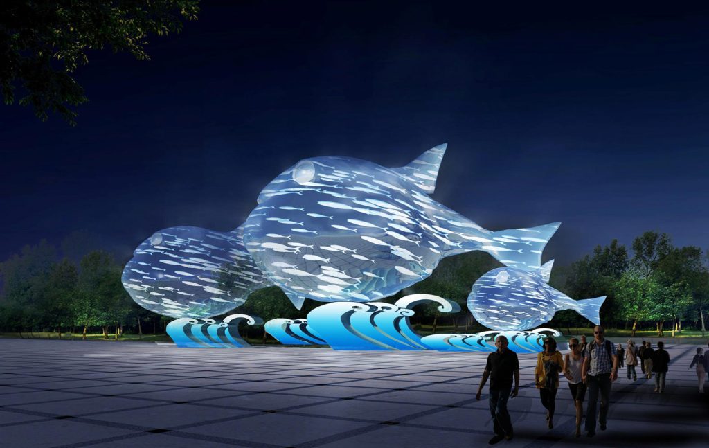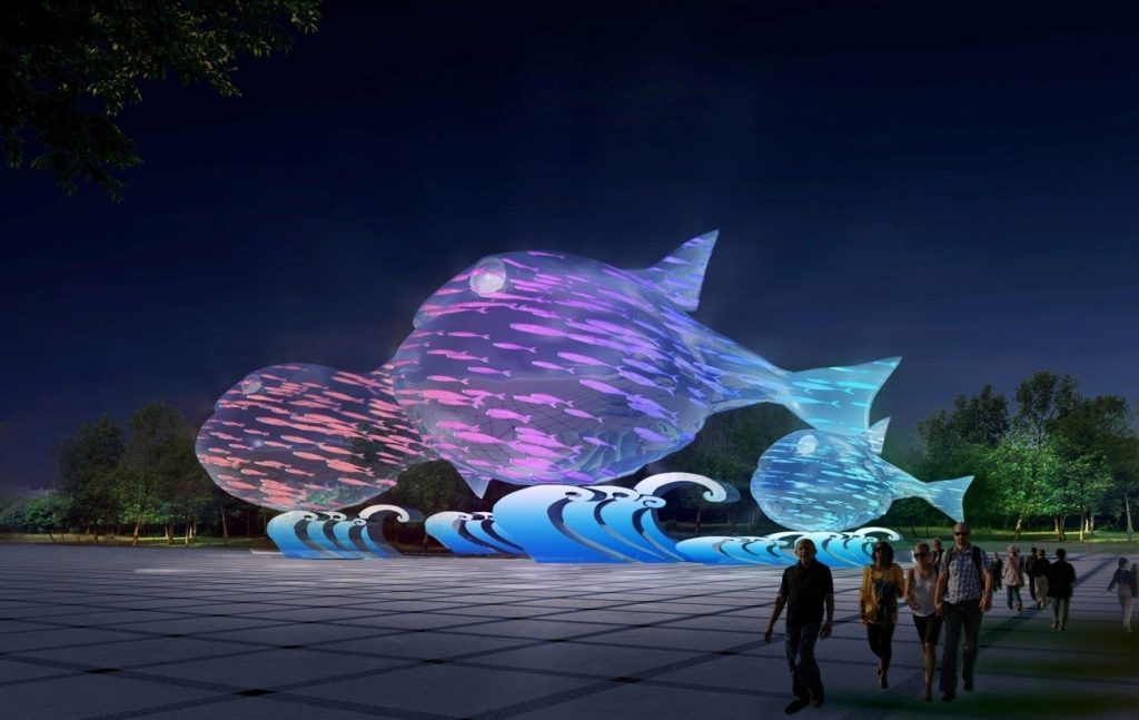 This refined scene highlights Lighting Art Sculpture Design with subtlety. We used gentle floodlighting design (soft white tones) to emphasize the fish installation’s texture and form, complemented by outdoor lighting design for the plaza’s functional illumination. Aligned with Cultural tourism lighting planning and design, the scheme balances artistic appeal and comfort, creating a serene yet memorable nocturnal spot for cultural tourism visitors.