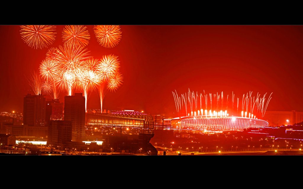 This festive stadium scene employs Landmark Building Lighting Design tailored to celebratory contexts (per Urban Lighting Planning and Design). Architectural Lighting Design bathes the venue in vivid red, while Outdoor Lighting Design complements the surrounding urban fabric. The scheme aligns with event-specific ambiance: the stadium’s illuminated facade pairs with fireworks to craft a vibrant, memorable nocturnal landscape for large-scale gatherings.