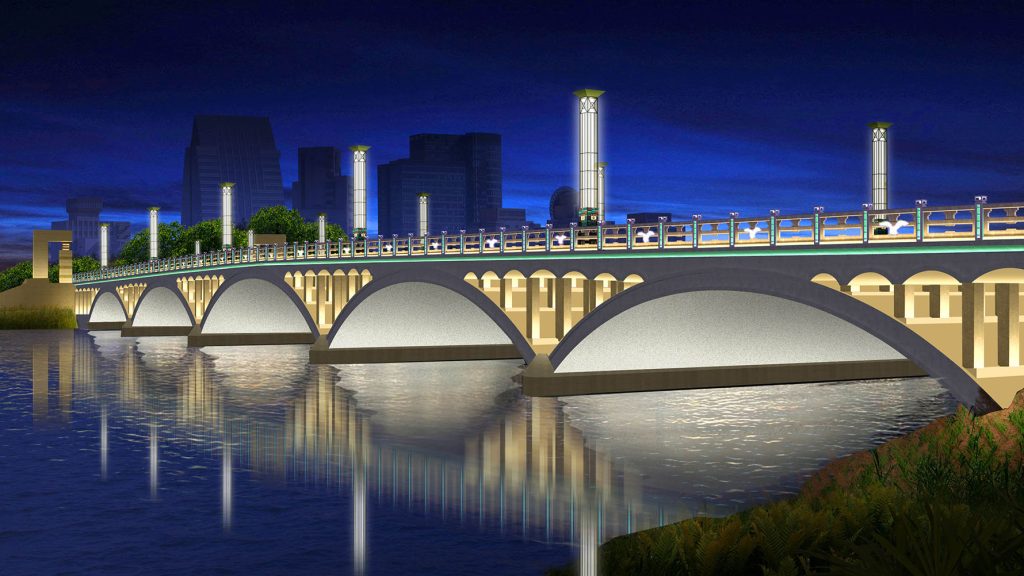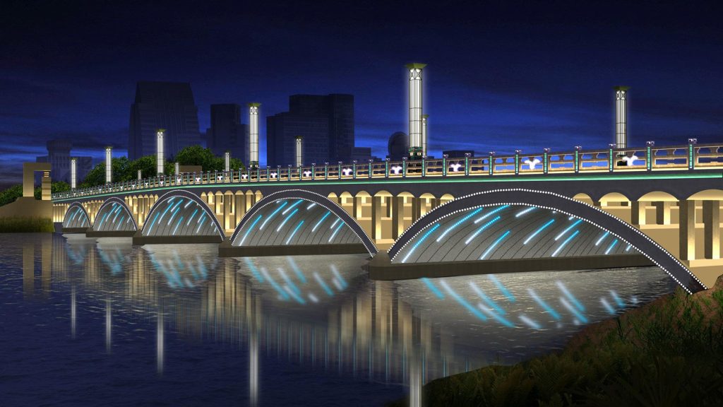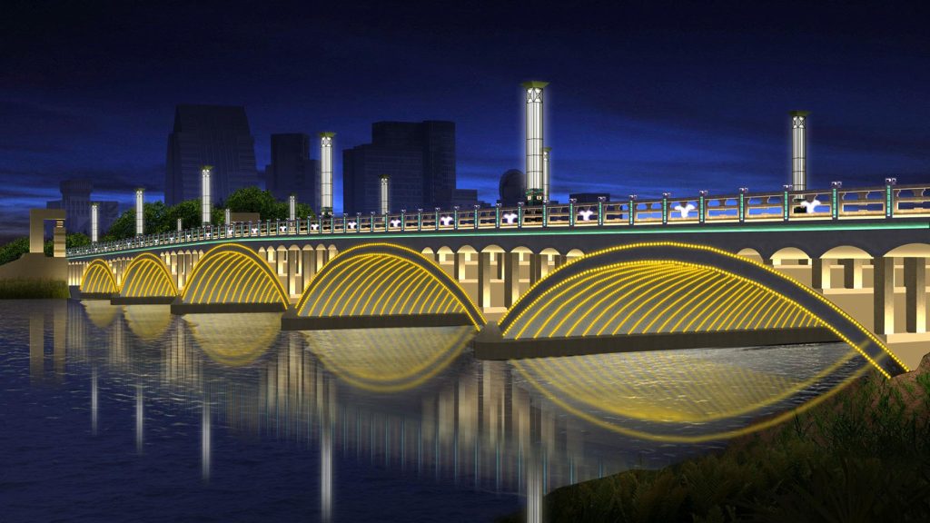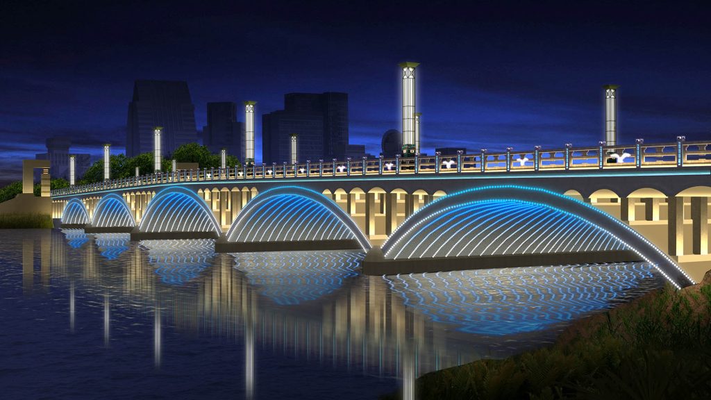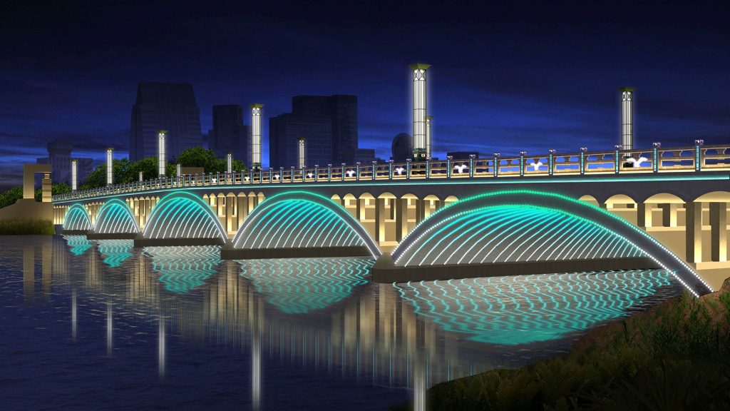 This bridge’s night aesthetic shines through meticulous lighting design: the arches feature dynamic aquatic-themed exterior illumination, while the parapet uses layered outdoor lighting for safety and charm. Architectural lighting accentuates the structure’s lines, paired with flood design to soften stone textures. Tall lampposts blend functional glow with decorative flair, framing this span as a city landmark illumination design—where light design merges artistry and utility, turning the waterfront into a luminous urban highlight.