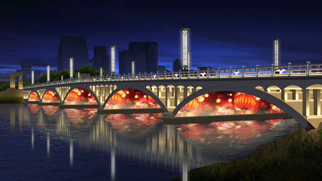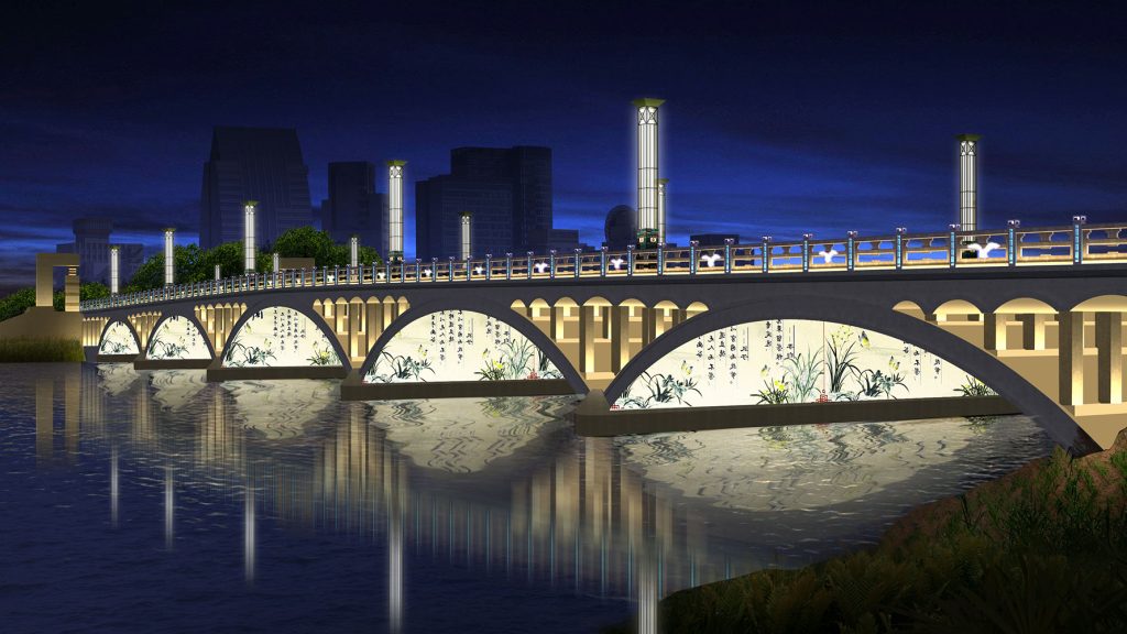 This span’s lighting design blends thematic exterior illumination: lantern motifs, ink-painting textures, and moonlit scenes adorn arches, balanced by outdoor lighting on railings. Architectural lighting accentuates stone lines, while flood design softens textures. Each scheme elevates city landmark illumination design—merging cultural storytelling with light design to turn the bridge into a luminous, narrative-driven waterfront highlight.