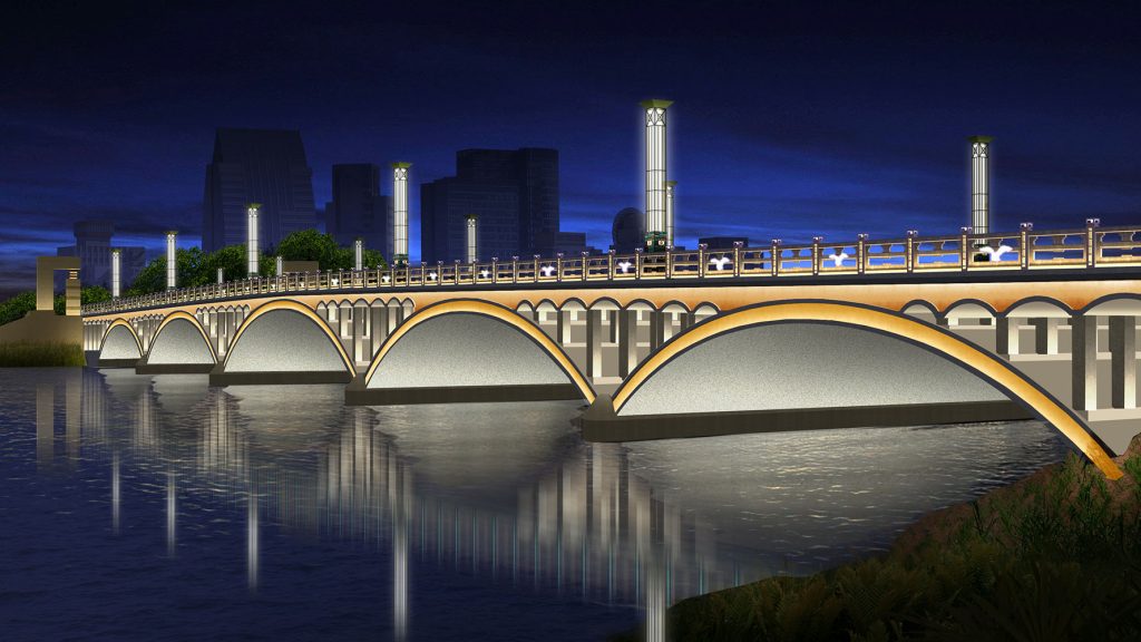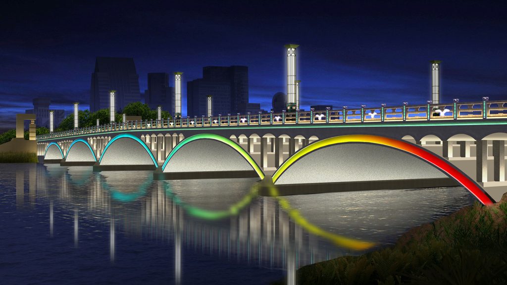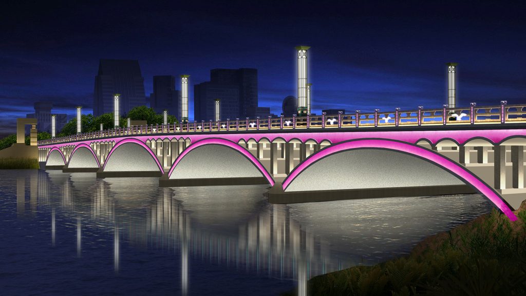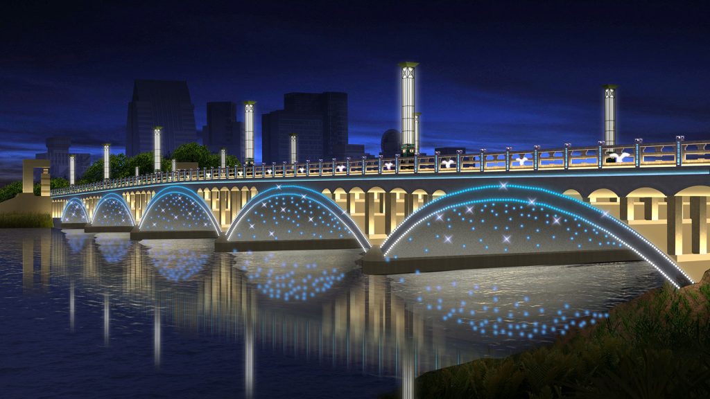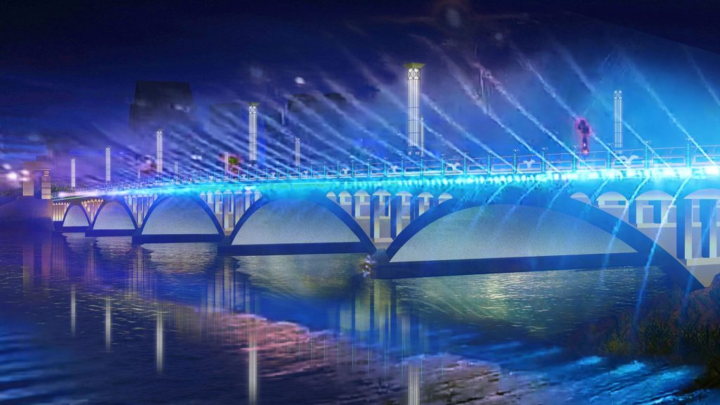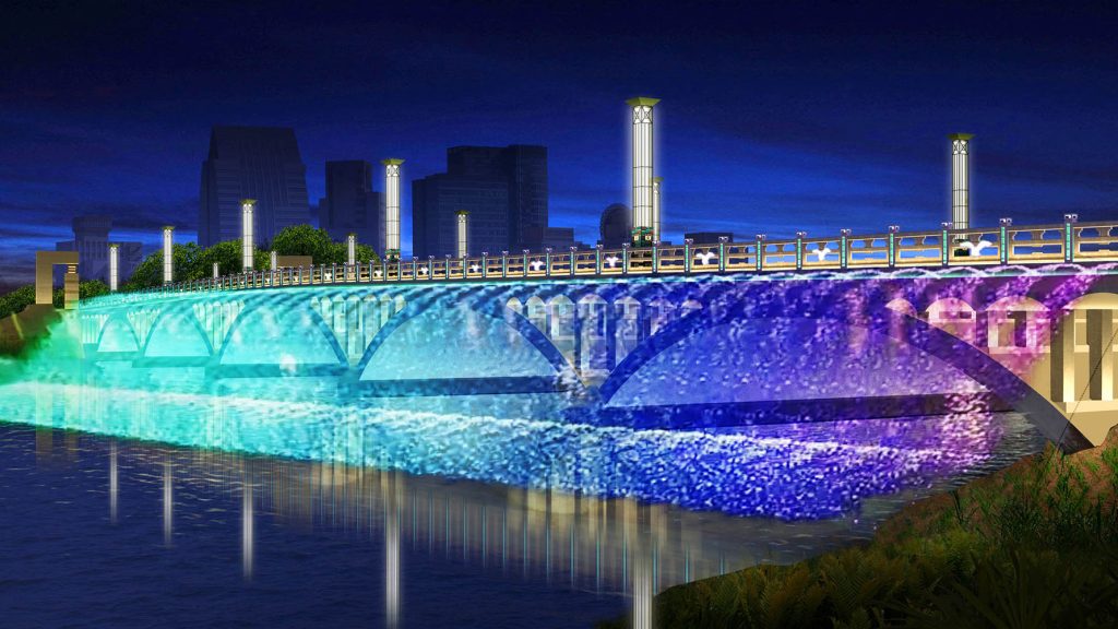 This span shines via layered lighting design: arches feature aquatic-patterned exterior illumination, paired with outdoor lighting on railings for ambiance. Architectural lighting accentuates stone details, while flood design amplifies depth. Tall lampposts anchor city landmark illumination design, where light design fuses dynamic visuals with structural grace—turning the bridge into a glowing waterfront focal point.