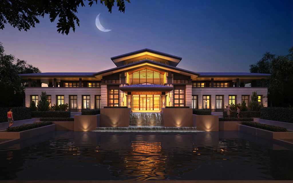 This waterside clubhouse features a poetic Illumination Design of Real Estate Complex. Architectural Lighting Design lights up the facade and entrance, while Floodlighting Design highlights the water wall. Exterior Lighting Design blends landscape lights, and the light reflection on water amplifies the tranquil, luxurious ambiance of this real estate supporting facility.