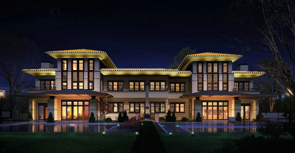 This luxury villa’s night view relies on a refined Illumination Design of Real Estate Complex. Its Architectural Lighting Design uses gentle Floodlighting Design to accentuate the facade’s texture without glare, fitting the residential elegance. Exterior Lighting Design pairs with water feature lights, crafting a quiet, high-end nighttime ambiance that elevates the villa’s premium appeal.