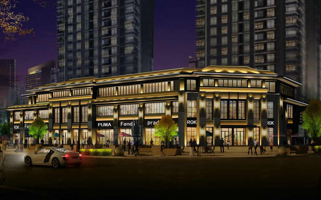 This commercial real estate block features a vibrant Illumination Design of Real Estate Complex. Architectural Lighting Design uses warm Floodlighting Design to highlight the facade, while Exterior Lighting Design brightens storefronts and footpaths. The scheme draws pedestrian flow effectively, merging aesthetic appeal with commercial functionality for the nighttime business zone.