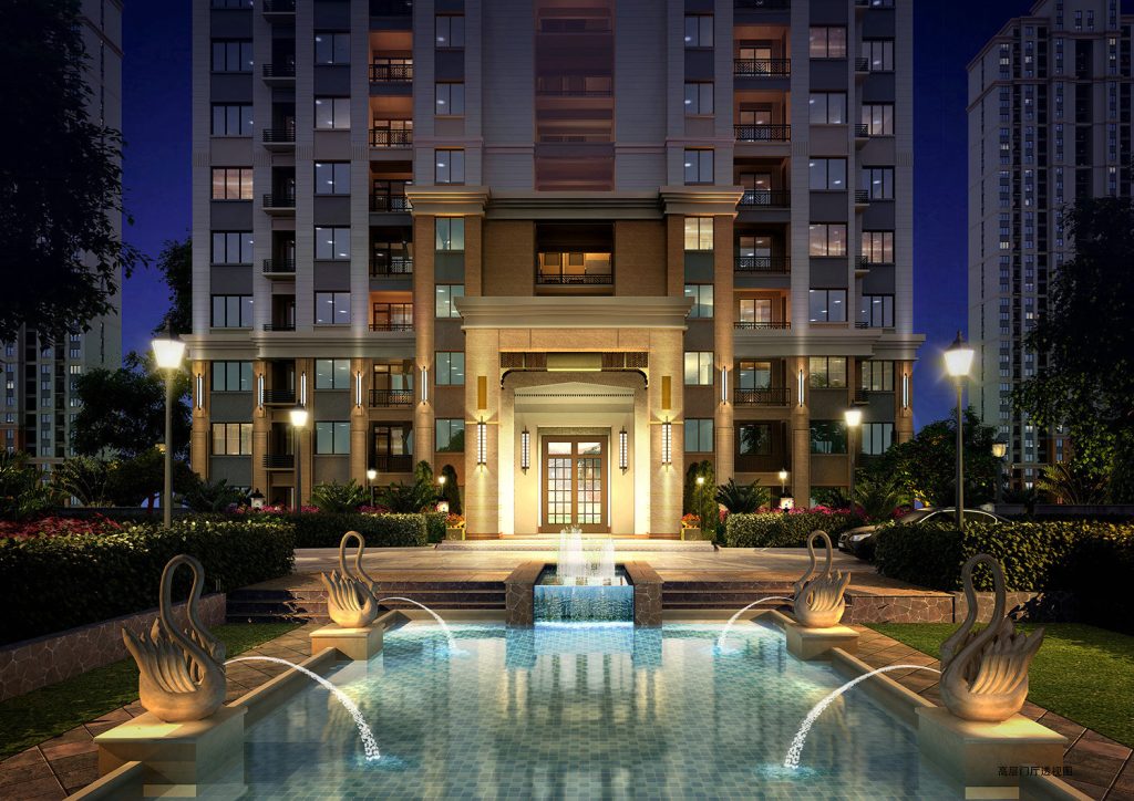 This residential entrance’s night view uses a sophisticated Illumination Design of Real Estate Complex. Architectural Lighting Design highlights the entrance facade, while Floodlighting Design illuminates the water feature to enhance elegance. Exterior Lighting Design integrates courtyard lights, crafting a high-end, welcoming entry ambiance that elevates the residential experience.