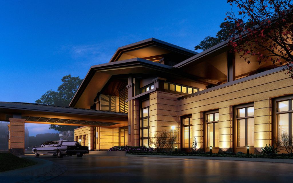 This real estate clubhouse showcases an elegant Illumination Design of Real Estate Complex. Architectural Lighting Design employs warm Floodlighting Design to emphasize the facade’s material texture, while Exterior Lighting Design coordinates with driveway lights. The scheme crafts a refined, high-end nighttime vibe, fitting the clubhouse’s premium supporting role in the estate.