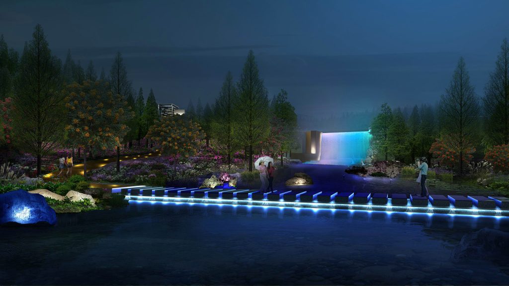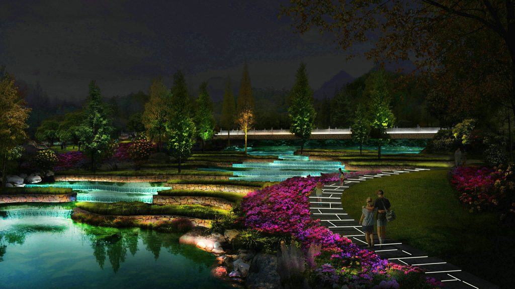 This scene showcases a park’s stream and footpath under Park landscape Lighting Design. Layered floodlighting design highlights the stepped water features and surrounding vegetation, while outdoor lighting design (linear lights on the path) guarantees pedestrian safety. Targeted landscape lighting accentuates the vibrant colors of flowers, blending soft illumination with natural scenery to create a cozy, inviting night-time strolling atmosphere—embodying the precision of professional park lighting details.