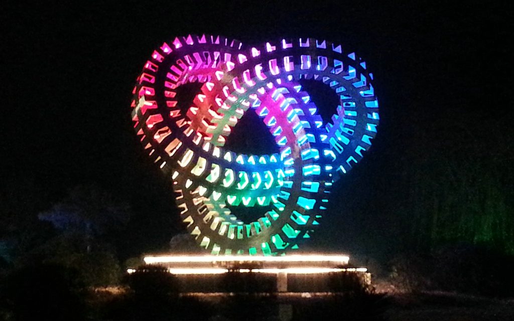 This nighttime view features a captivating Lighting Art Sculpture Design—an intertwined ring-shaped installation. It employs dynamic light design with vivid RGB color transitions (red, pink, blue, green), using integrated LEDs to accentuate the structure’s intricate details. As a key element of outdoor lighting design, the scheme merges sculptural art with professional illumination techniques, creating an eye-catching nighttime focal point that balances visual allure and thematic coherence.