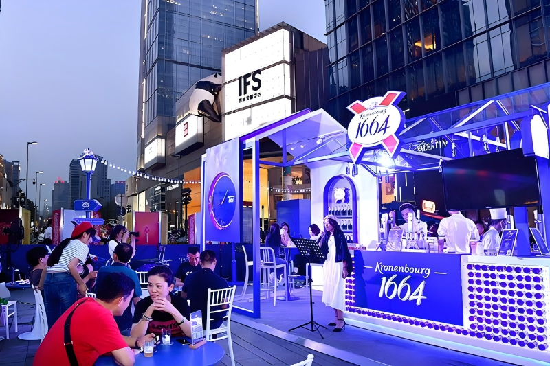 For this commercial pop-up zone, our outdoor lighting design uses targeted blue lighting to accent the booth, paired with background architectural lighting design for surrounding high-rises. The scheme merges brand-focused lighting design with functional ambient illumination, boosting foot traffic and creating a vibrant nighttime commercial atmosphere—core to our commercial scene lighting solutions.