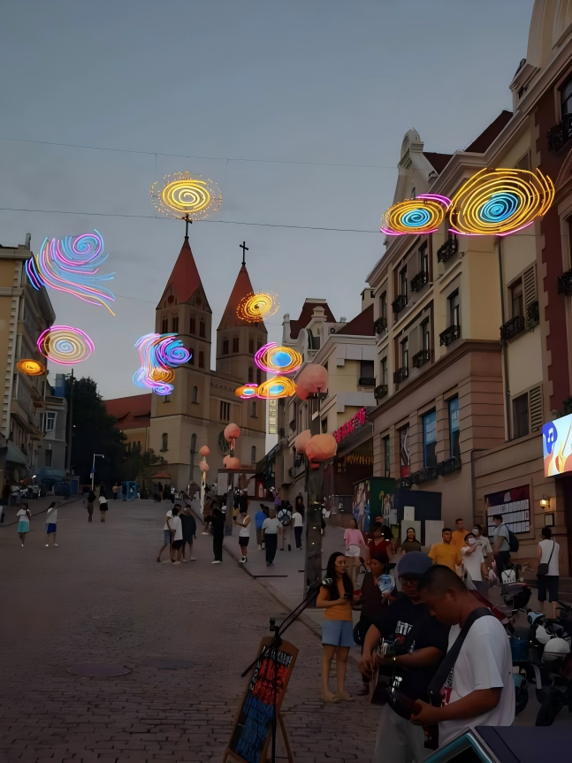 Our lighting design integrates architectural lighting design (soft floodlighting design for the church facade) with creative outdoor lighting installations (colorful spiral lights). We also incorporated Urban Road Lighting Design for pedestrian safety, blending cultural building illumination with artistic light elements to craft a captivating cultural tourism night scene.