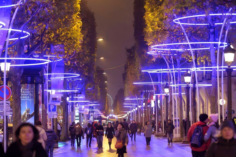 This boulevard showcases our expertise: Urban Road Lighting Design forms the safety base, while artistic outdoor lighting design (blue ring fixtures) and floodlighting design (for tree canopies) create an immersive walkspace. Paired with subtle architectural lighting design for flanking buildings, the scheme turns the avenue into a visually striking nocturnal landmark.