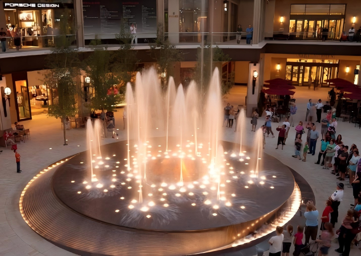 Our fountain lighting design takes center stage here: Layered lighting design (warm spotlights) accentuates the water feature, while architectural lighting design illuminates surrounding shops. This indoor-outdoor lighting design balances commercial space ambiance and visual focus, enhancing the mall’s nighttime allure—typical of our commercial landscape lighting solutions.
