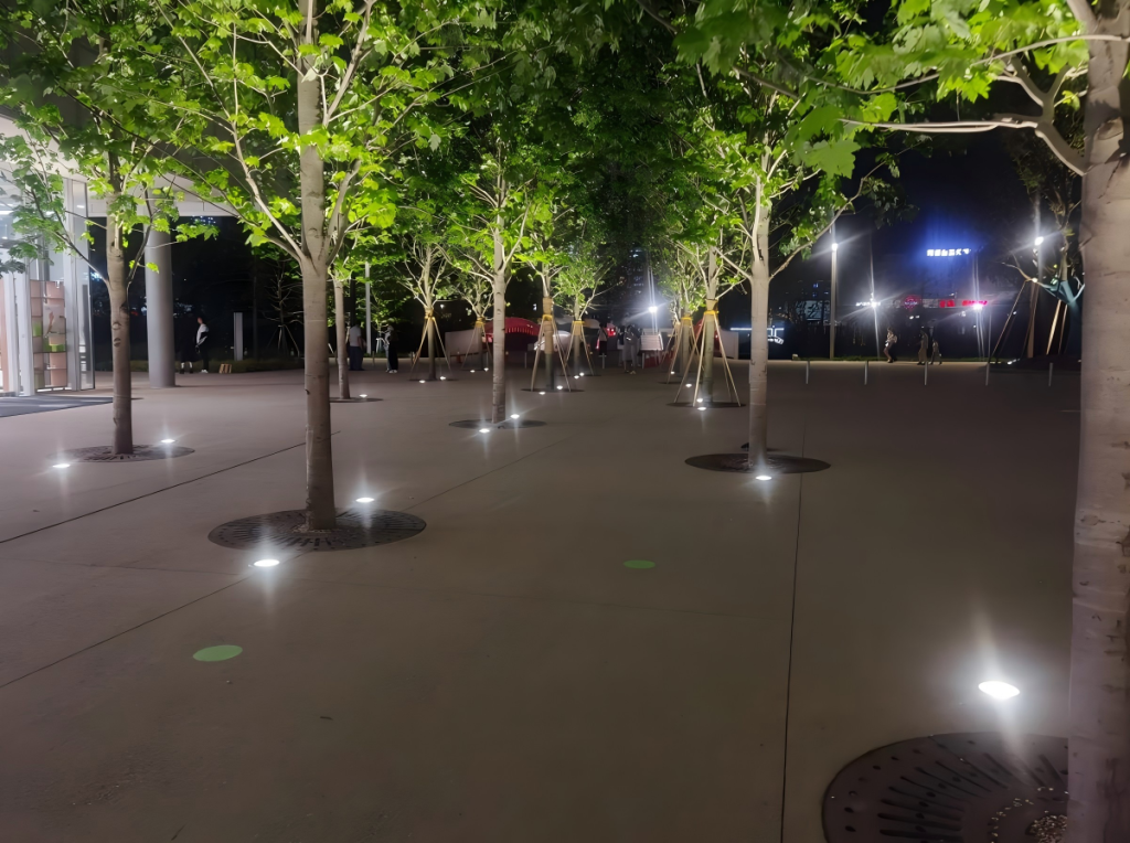 Our outdoor lighting design shines in this plaza: We used in-ground tree lighting design (a subset of floodlighting design) to highlight the tree canopy, paired with architectural lighting design for adjacent buildings and Urban Road Lighting Design for walkways. The scheme creates a tranquil, well-lit public space—embodying our focus on subtle, immersive landscape lighting.